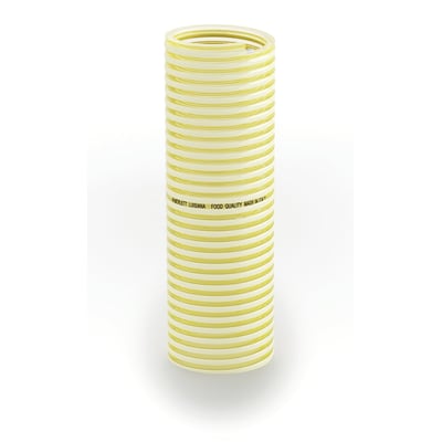 Gul transparent suge- og trykslange med hvid PVC spiral. Ideel til vand, juice, afløb og vakuumopgaver. Lugt- og smagsfri, fremstillet i levnedsmiddelgodkendt materiale.