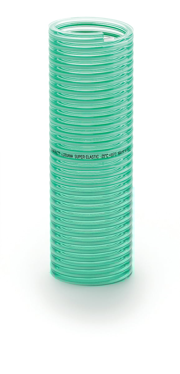 Grøn transparent Super Elastik suge- og trykslange, let korrugeret udvendigt og med indstøbt hvid PVC spiral – glat indvendigt. Let og meget fleksibel opbygning.