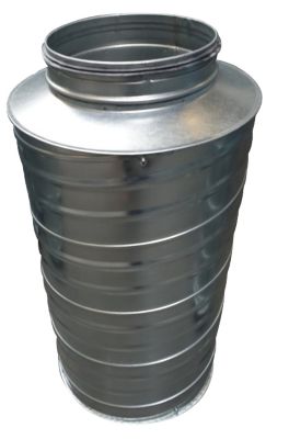 Lyddæmper med Ø630 og en længde på 900 mm. Fremstillet i galvaniseret stål med 50 mm isolering.
