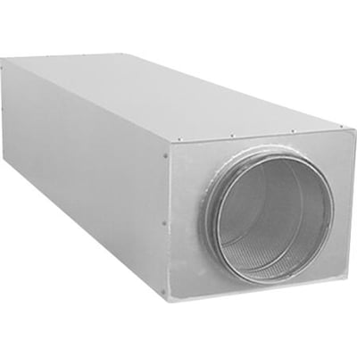 Kompakt lyddæmper med rektangulært kabinet og cirkulære tilslutninger. Velegnet til indbygning over nedhængte lofter.