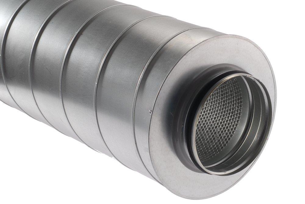 Ventilationslyddæmper i fast rør med 50mm isolering og dobbeltlægetætning.