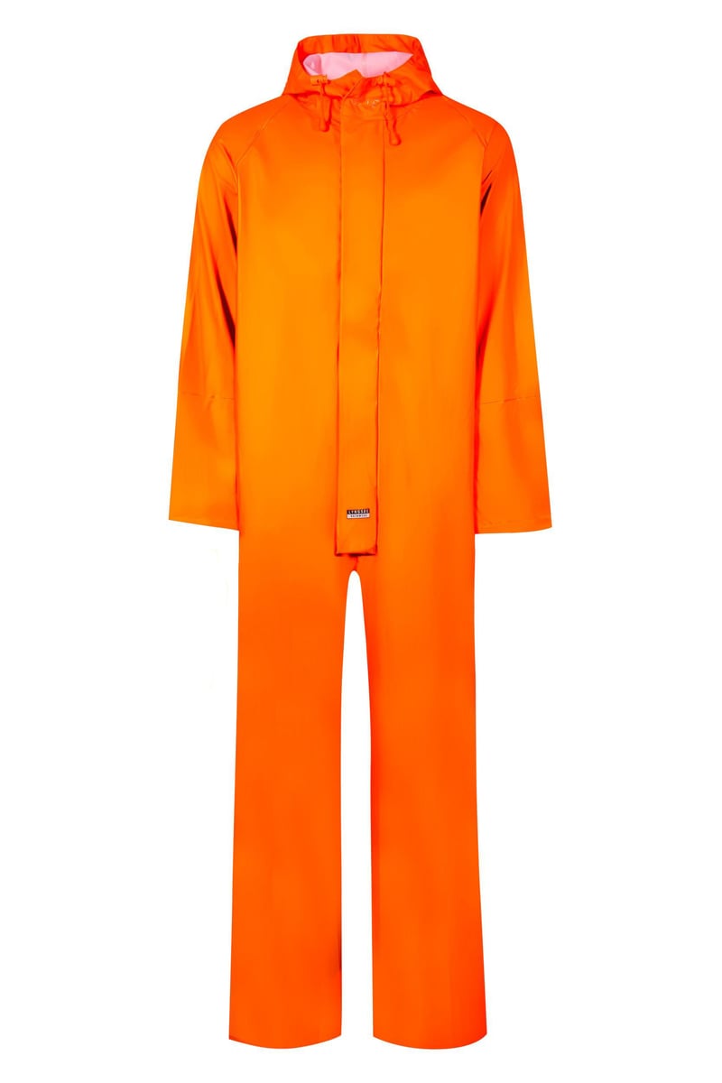 Vind- og vandtæt regndragt fra Lyngsøe Rainwear i PU kvalitet. Med fast hætte, dobbelt stormklap og justering ved ankler.