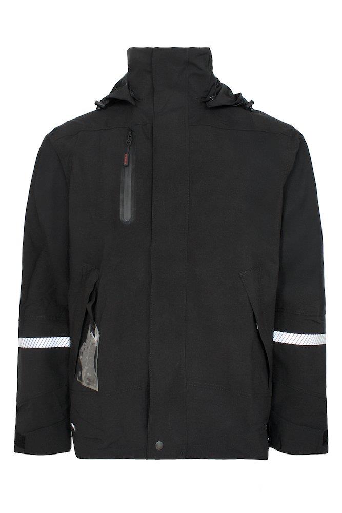 Åndbar, vind- og vandtæt skaljakke i 100% Polyester Stretch med PU Membran. >20.000 MM vandtæthed, 14.000g/m2/24h åndbarhed. Tapede sømme.