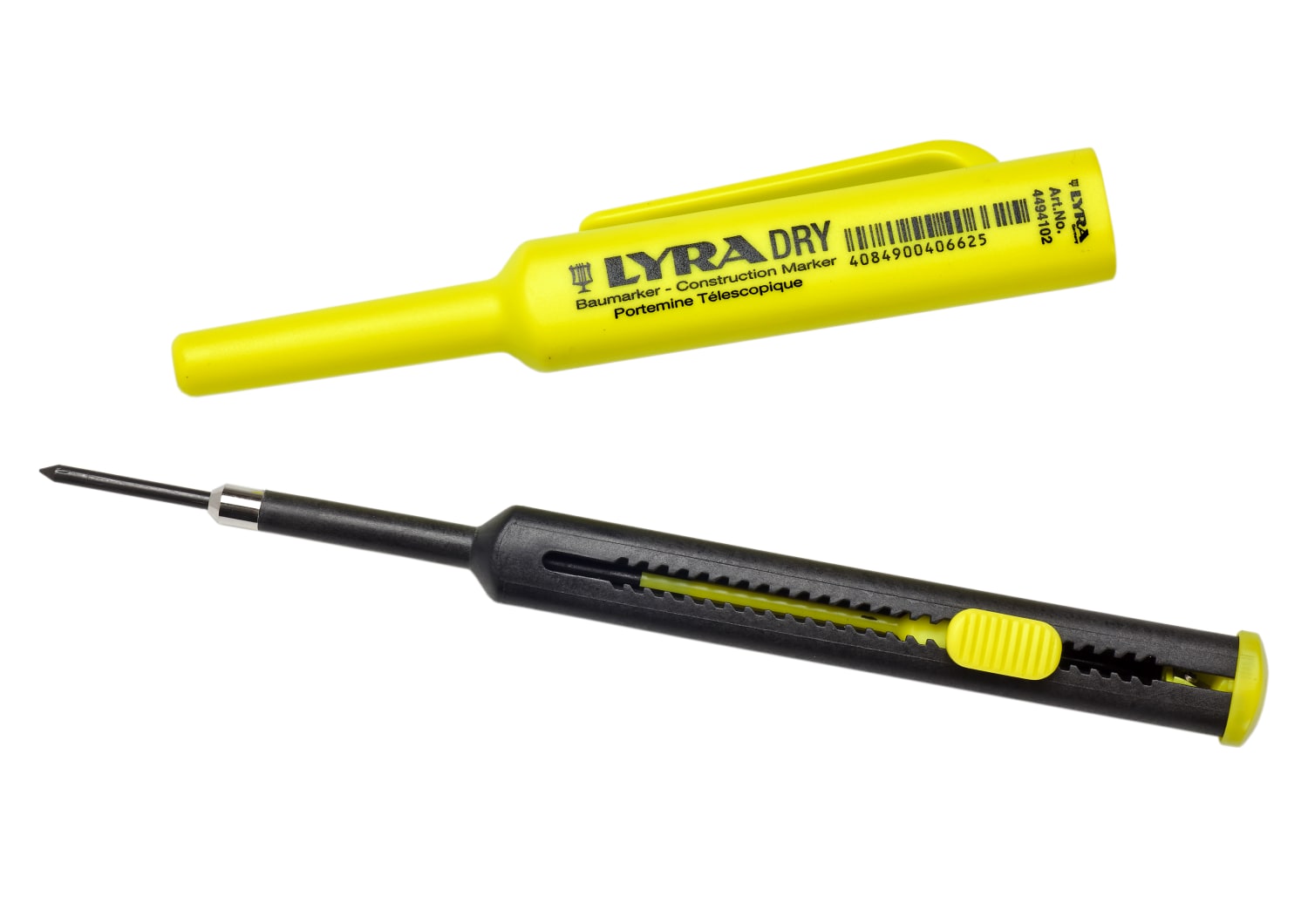 Lyra Dry dybhulspen med grafitstift til opmærkning på fugtige, støvede, glatte og mørke overflader. Med udtrækkelig stift og indbygget blyantspidser.