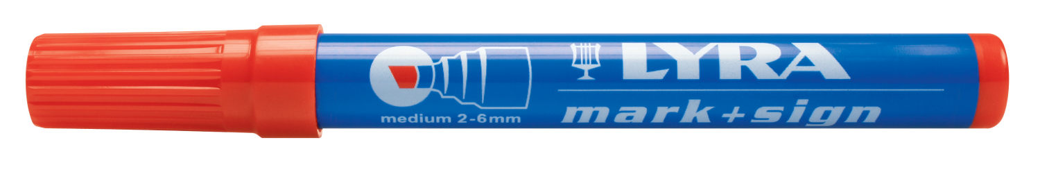 Lyra Speedmarker 4010 med 2-6 mm skrå spids i rød. Vandfast tusch, der er velegnet til både glatte og porøse overflader. Hurtigtørrende, xylen- og toluolfri blæk.