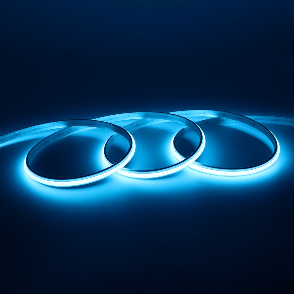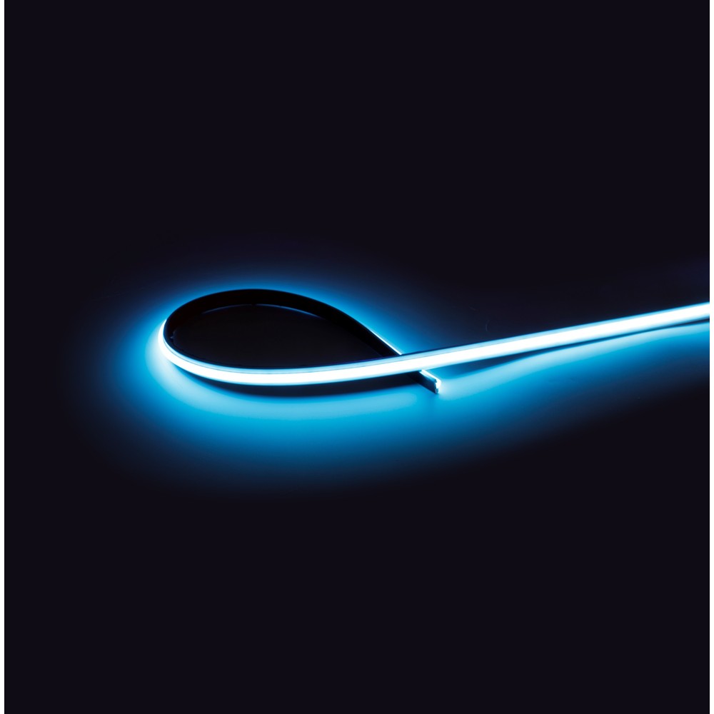 Oplev et ensartet og prikfrit lyseblåt lys med denne COB LED-strip. Med 240 LED pr. meter elimineres synlige dioder, hvilket skaber en jævn og behagelig lysfordeling. Denne LED-strip er ideel til dekorativ belysning og kan skabe en unik atmosfære i ethvert rum.