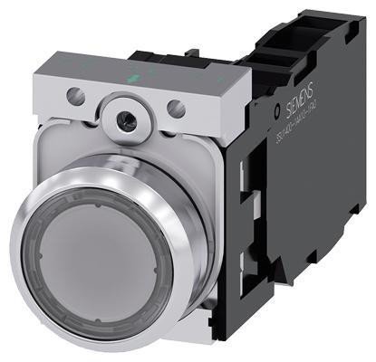 22 mm lystrykknap med flad trykknap, momentan kontakt type, 1 NO+1 NC, LED modul med integreret LED 230 V AC og skrue terminal.