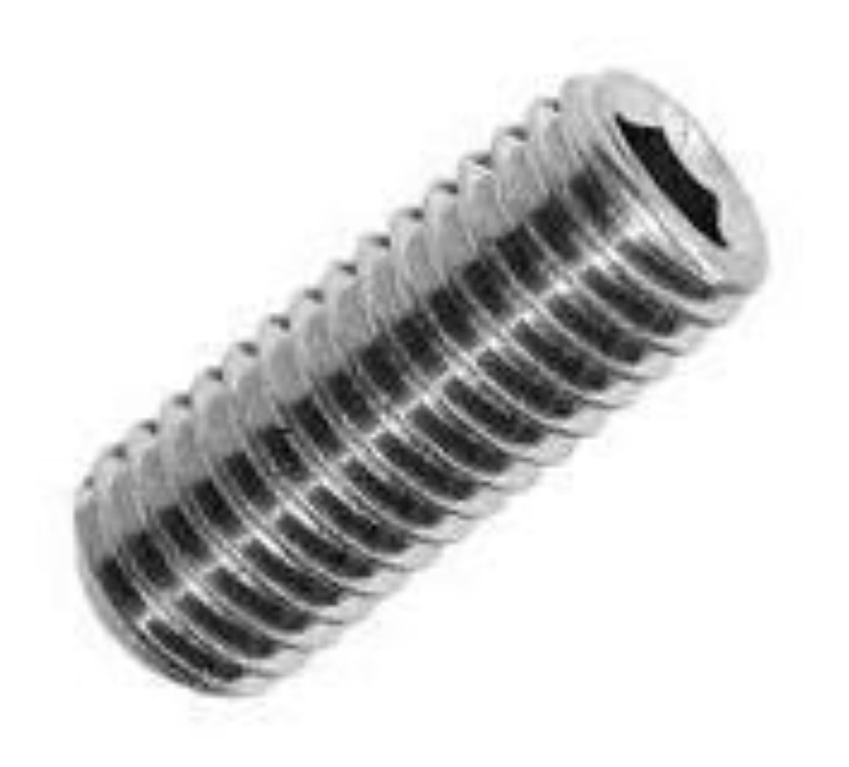 Rustfri M2,5X4 ISO 4029/DIN 916 pinolskrue med indvendig 6-kant og krater.