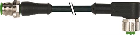 Følerkabel, sensorkabel eller transmissionskabel til sensorer eller aktuatorer. M12 han lige 3-polet / M12 hun vinklet 3-polet, kabel 3x0,34mm2 sort PUR.