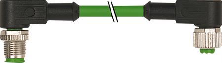 Dette Cube67 M12 kabel er designet med et vinklet 6-polet hanstik i den ene ende og et vinklet 6-polet hunstik i den anden ende. Kablet er A-kodet og skærmet i en grøn PUR UL/CSA kvalitet, der er velegnet til brug i kabelkæder.
