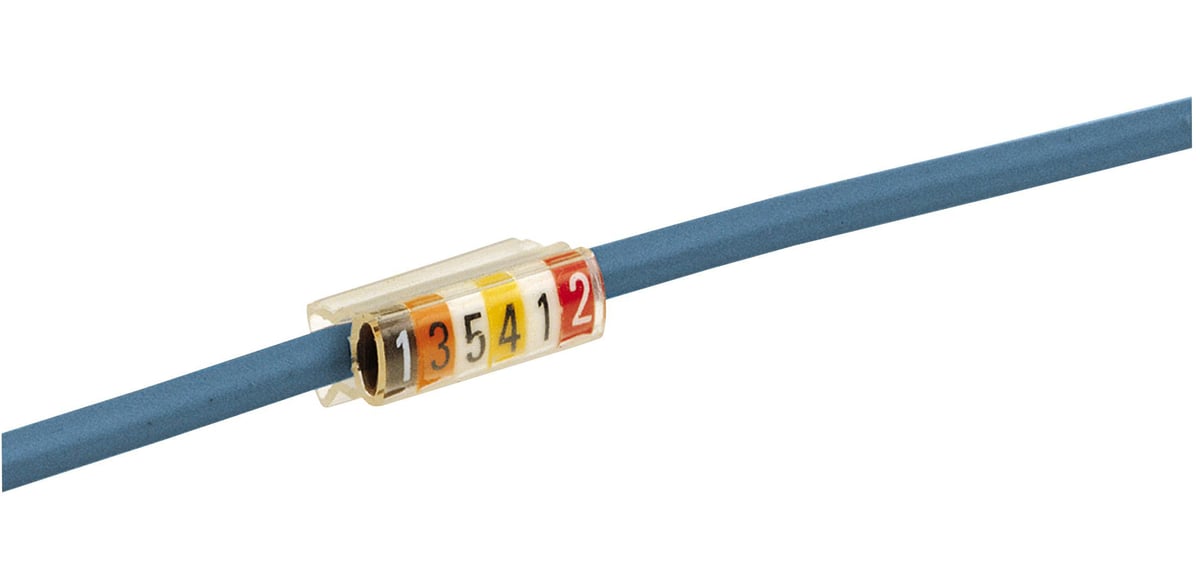 Legrand Memocab mærke nr. 3 til ledninger. Mærket har international farvekode - orange med sort eller hvid skrift.