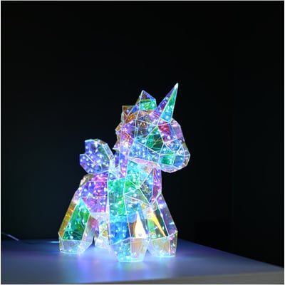 Magisk enhjørning dekoration til indendørs brug. 30 cm høj, 25 cm bred. Kræver 3x AA batterier (medfølger ikke). Med timerfunktion.