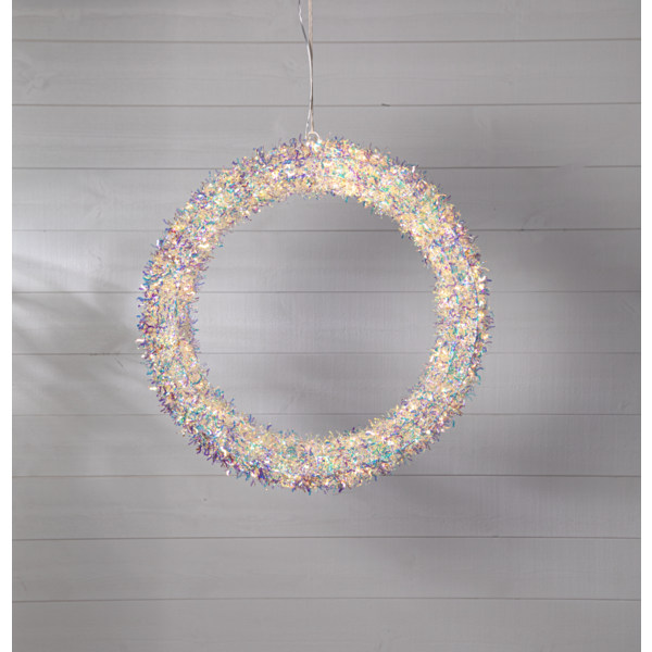 Kransen er fremstillet af holdbart plastmateriale og er specielt udviklet til udendørs anvendelse, hvilket sikrer lang holdbarhed og modstandsdygtighed over for vejr og vind. Den transparente ledningsfarve bidrager til et diskret udseende, så fokus udelukkende er på lysene.