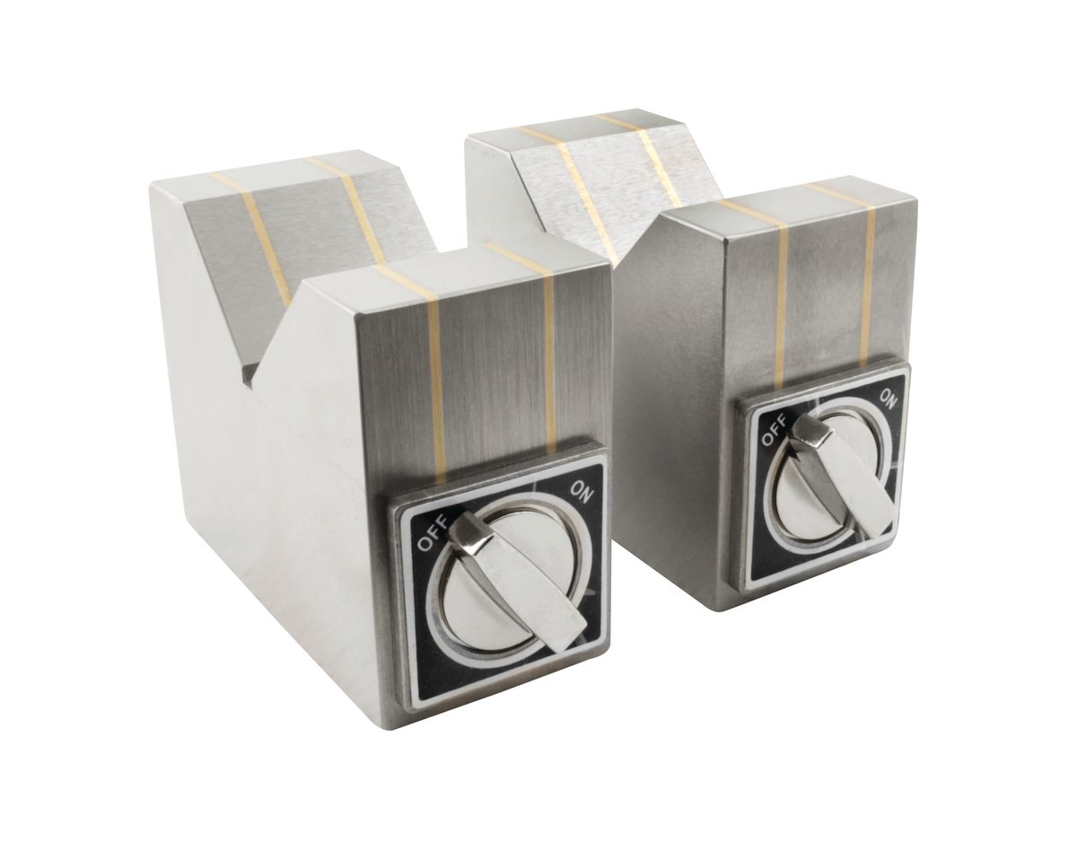 Praktisk sæt med 2 magnet V-blokke i stål-messing med on/off funktion. Perfekt til fastspænding.