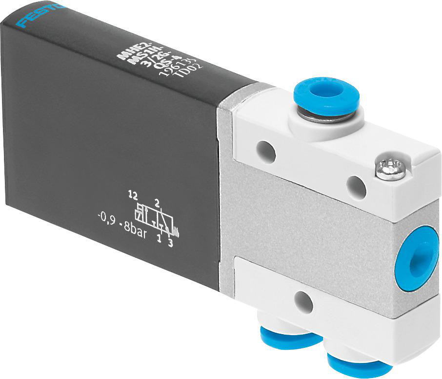 Festo magnetventil MHE2-MS1H-3/2G-QS-4 til hurtig omskiftning. Direkte aktiveret sædeventil med koblingstider ned til 2 ms. Bredde: 10 mm.