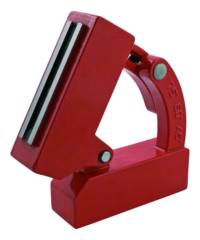 Justerbar magnetvinkel med håndgreb fra Diesella. Vinkel justeres fra 45°- 90° og er markeret ved 75°, 60° og 45°. Magnetmål: 140 x 140 mm.