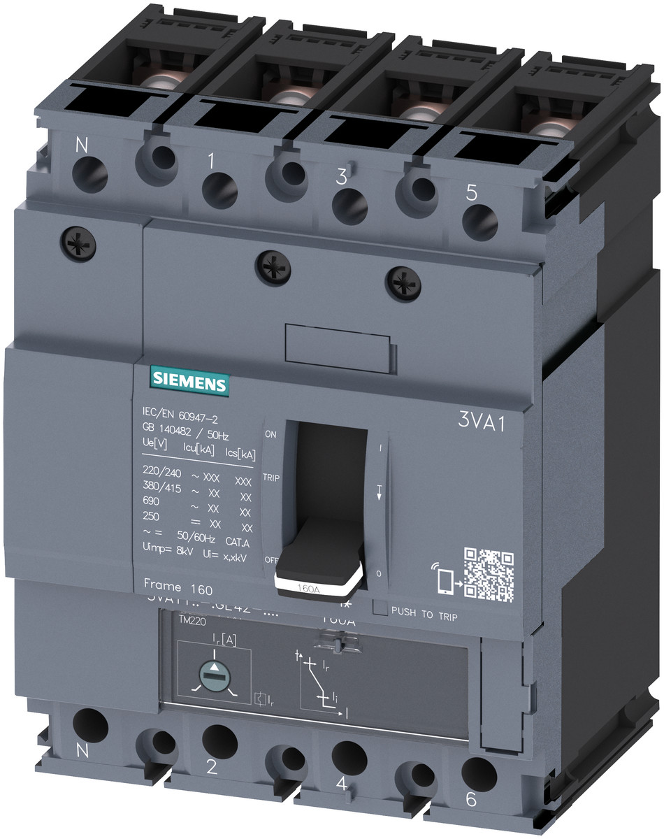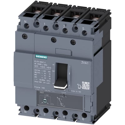 Siemens 3VA1 IEC maksimalafbryder, størrelse 160, med brydeevne klasse N. ICU=25kA ved 415 V. 4-polet med anlægsbeskyttelse TM220, IN=80A og overload beskyttelse.
