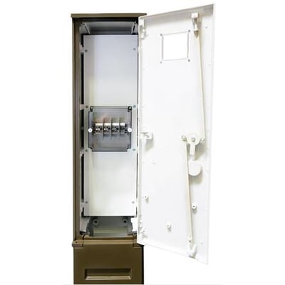 Klasse II målergadeskab fra Fibox med rude og målerklemrække. IP44. Fremstillet i polyester med en forventet levetid på 25 år. Elektrisk dobbelt isoleret i hele skabet.