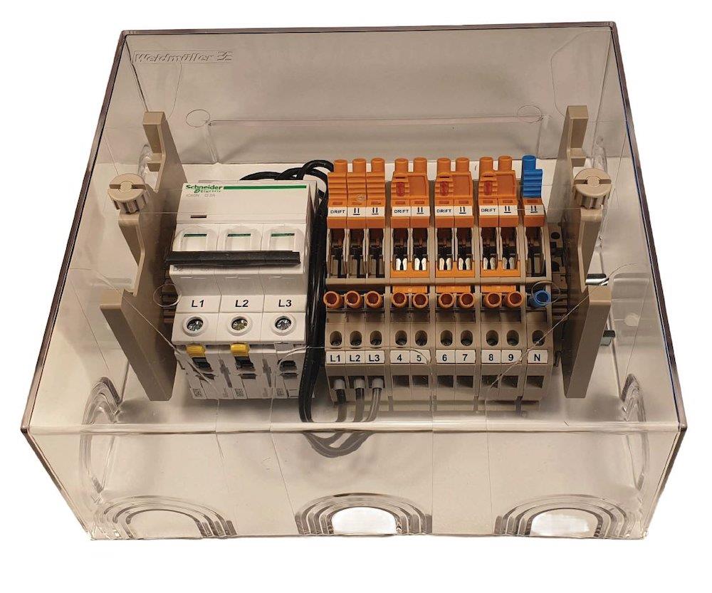 Denne målerklemrække er designet til trafomåling og inkluderer en 3-polet 2A D automatsikring samt et gennemsigtigt låg.