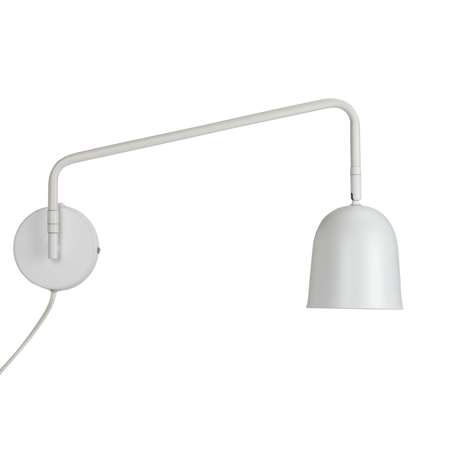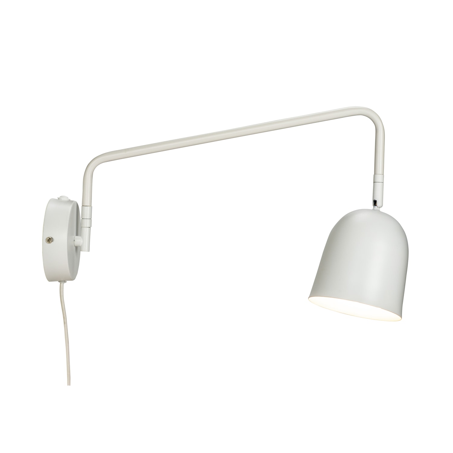 Væglampe med god afstand til væggen. On/off sidder på toppen af vægholderen, hvilket gør den nem at betjene. Skærmen kan justeres og vippes.