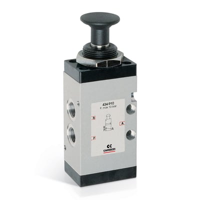 Ventiler Mod. 434-91... med manuel betjening, 3/2 NC, 1/4 tilslutning, tryk-træk knap og fjeder.