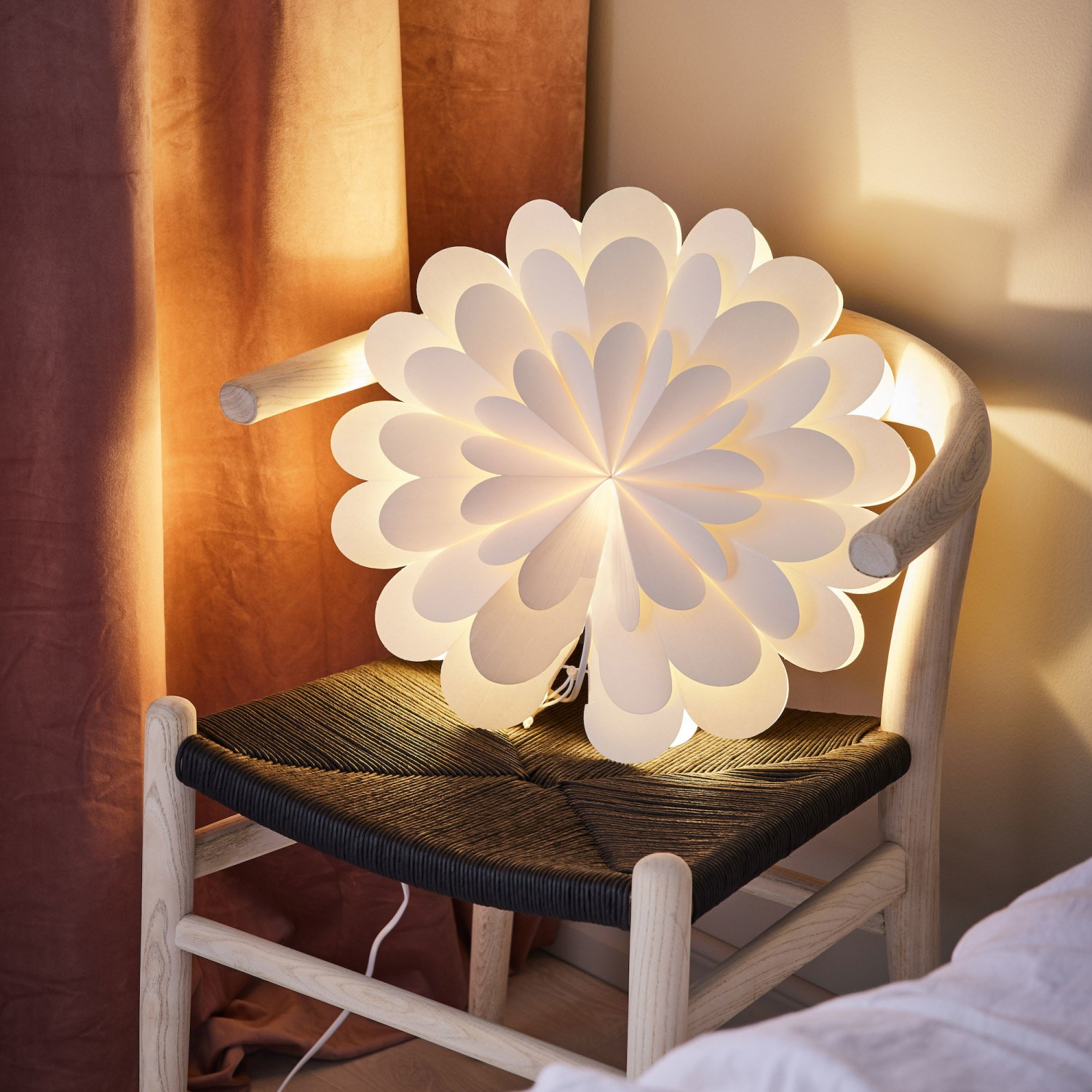 Stjernen har en diameter på 45 cm og er udført i en tidløs hvid farve, der nemt integreres i forskellige indretningsstile. Den leveres med en 3,5 meter lang, klar tilslutningsledning, hvilket giver fleksibilitet i placeringen. En praktisk afbryder er inkluderet for nem tænd/sluk-funktion.