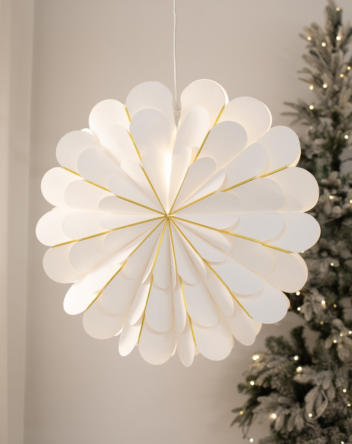 Marigold stjerne i hvid, med en diameter på 60 cm, til indendørs brug. Inkluderer 3,5 meter ledning og afbryder.