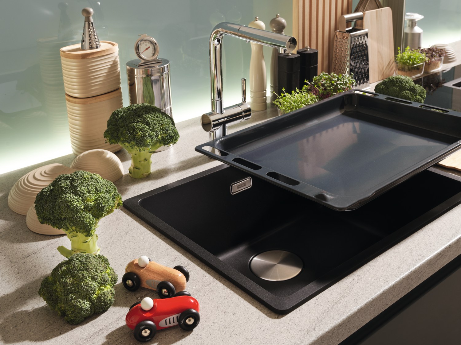 Med en bredde på 560 mm og en dybde på 440 mm passer vasken til et 600 mm underskab. Den leveres med en manuel kurveventil og en vandlås.