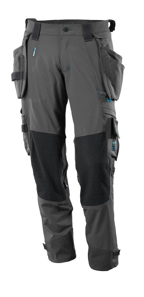 Håndværkerbuks med aftagelige hængelommer, vandafvisende finish og 4-vejs strækstof. Let og slidstærkt materiale.