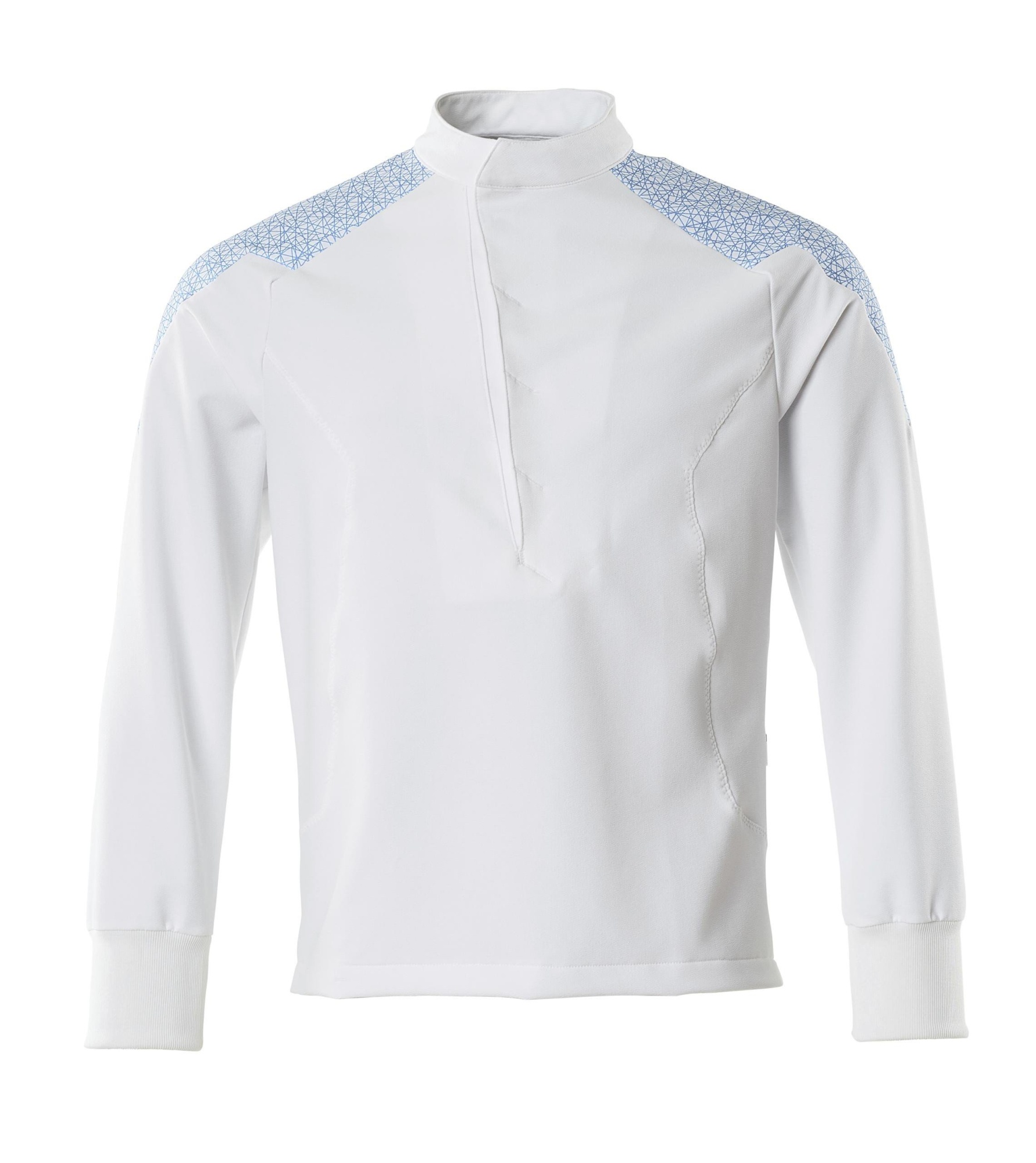 Slidstærk Mascot Busseronne 20052 Food&Care i hvid/blå, str. S. Fremstillet i strækstof med lav vægt. Med rib ved håndled og slids i siderne. Velegnet til industrivask.
