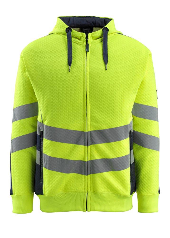 Fluorescerende sweatshirt med skrå, tværgående reflekser og moderne pasform. Behagelig bomuldsinderside og slidstærk polyester på ydersiden. Hætte med snøre.