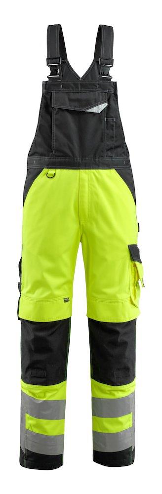 Smarte arbejds-overalls i fluorescerende gul og sort. Smudsafvisende og med mange praktiske lommer. Justerbare seler og benlængde.