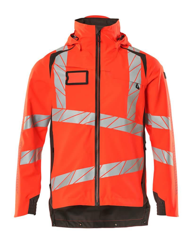 En hi-vis skaljakke i fluorescerende rød/antracit med reflekser. Vand- og vindtæt med høj åndbarhed og tapede sømme.