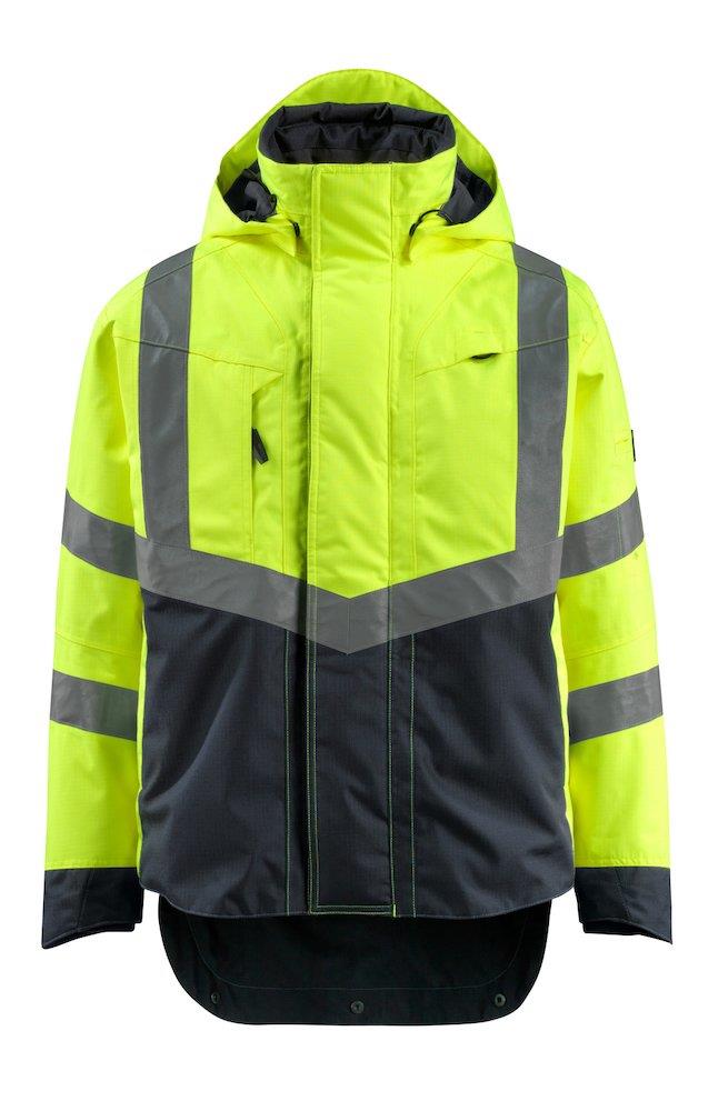 Fluorescerende skaljakke med lodrette og skrå reflekser. Åndbar, vind- og vandtæt med tapede sømme. Aftagelig hætte, ventilation under ærmerne og justerbar forlængelse af ryggen.
