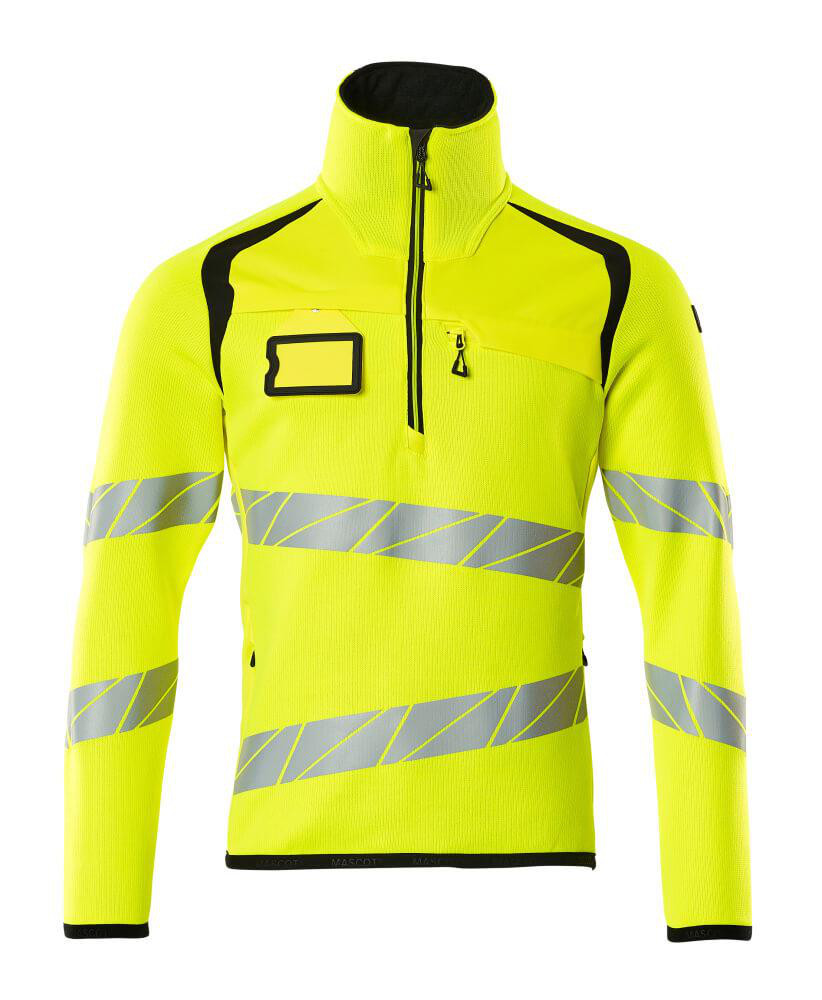 Premium striktrøje fra Mascot i Hi-Vis gul/sort med skrå, tværgående reflekser. Moderne pasform med høj krave og lynlås i halsen. Aftagelig ID-kortholder.