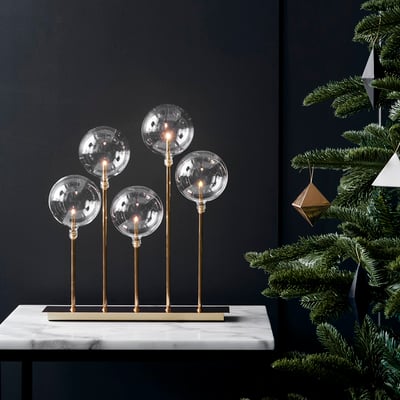 Mäster borddekoration fra Markslöjd. Denne elegante borddekoration har en base i metal og skærme i glas, der giver et stilfuldt udtryk.
