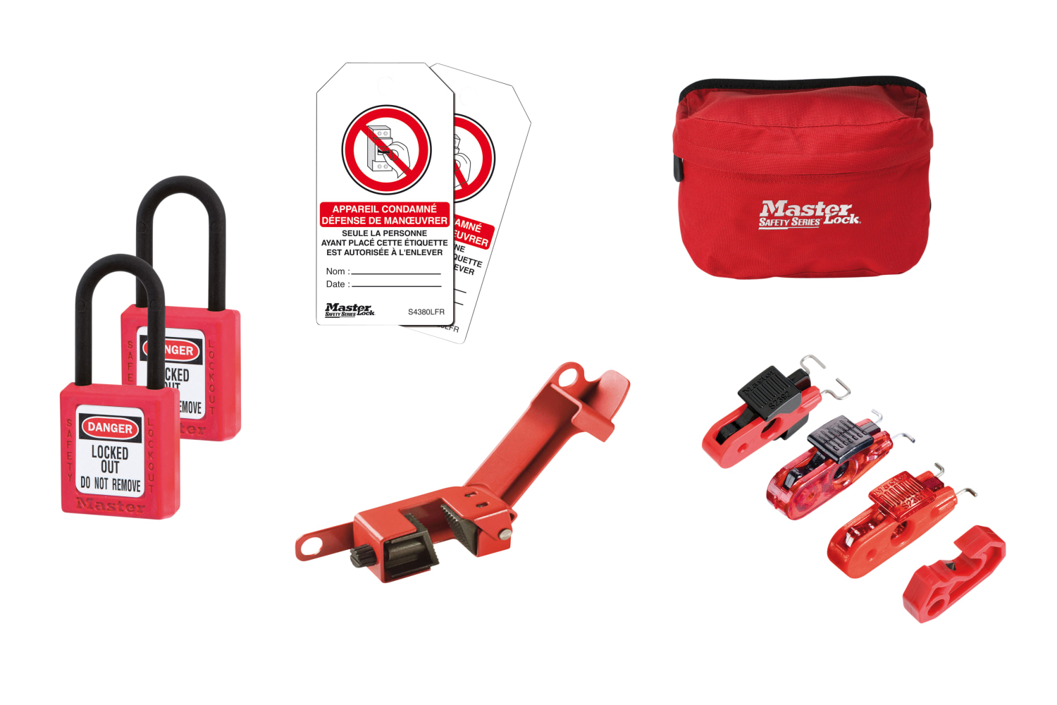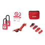 Masterlock elektrikerkit i taske til sikker aflåsning af automatsikringer, maksimal- og vippeafbrydere. Inkluderer hængelås, lock-outs, skilte og hasp for sikker vedligeholdelse.