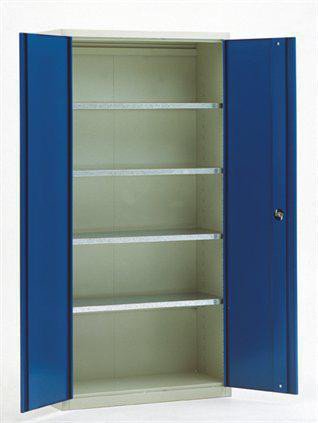 Fuldsvejst Blika materialeskab MS-1 med 4 hylder, bæreevne på 60 kg pr. hylde og 5-stiftet Ruko cylinderlås. Dimensioner: H:2000 mm, B:1000 mm, D:445 mm.