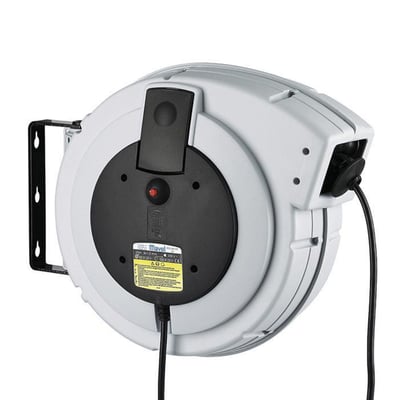 Automatisk kabelopruller fra Mavel med 20 meter H07 gummikabel, designet til værksteder, industri og byggepladser. Med langsom autooprul og svingbart væg/loftbeslag.
