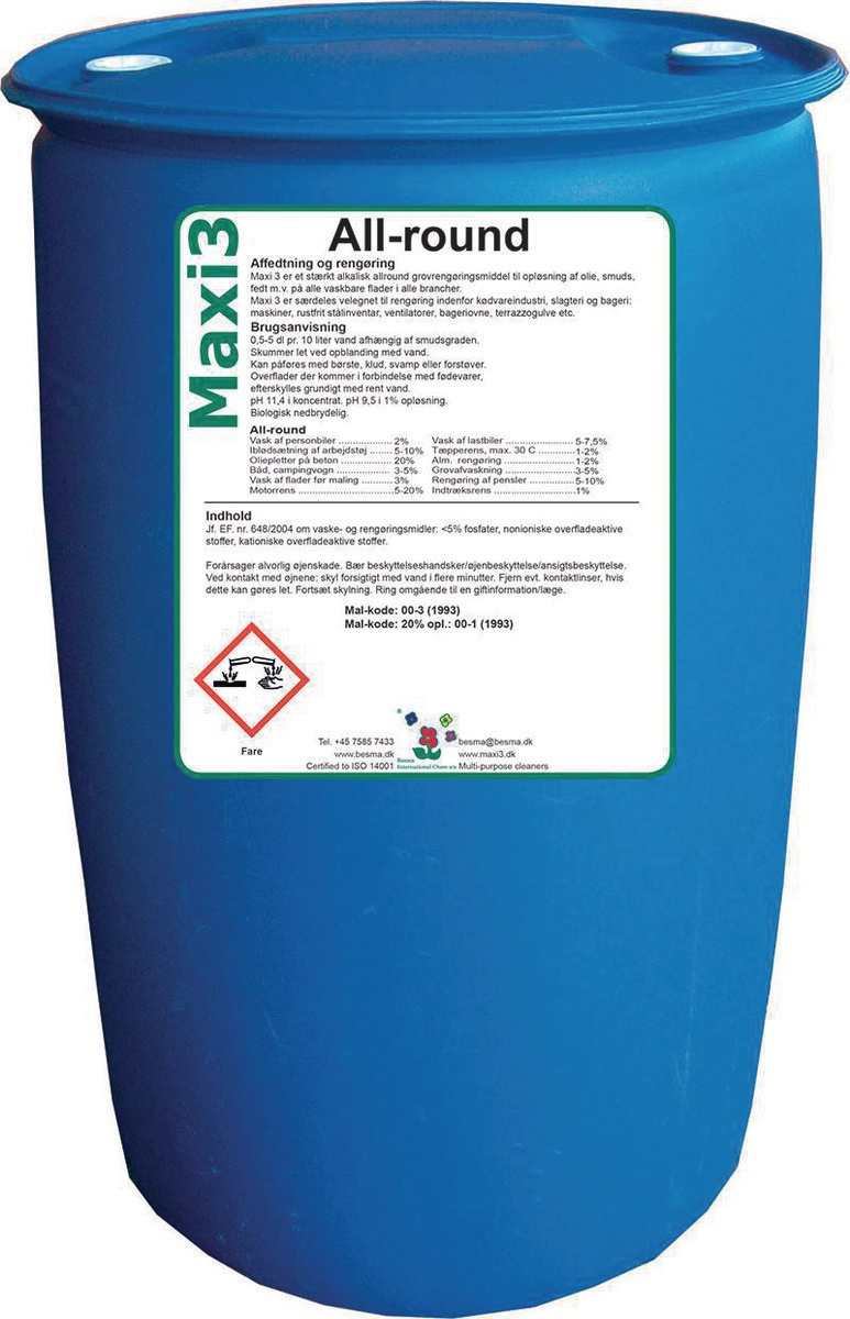 Maxi 3 All-round er et stærkt alkalisk grovrengøringsmiddel, der effektivt opløser: