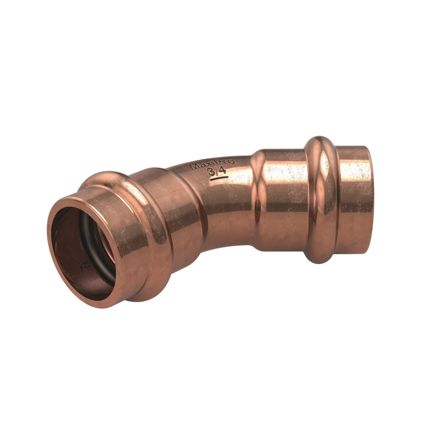 Denne >B< MaxiPro 45° bøjning er en 48 Bar presfitting, der er velegnet til de fleste køleapplikationer. Den er fremstillet i kobber og har en muffe.