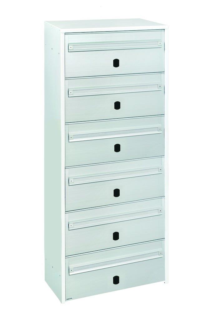 Postkasseanlæg til indendørs brug. Kabinet af malet, galvaniseret stål (1 mm) med front i sølvelox. aluminium (2,5 mm). Leveres uden cylinder.