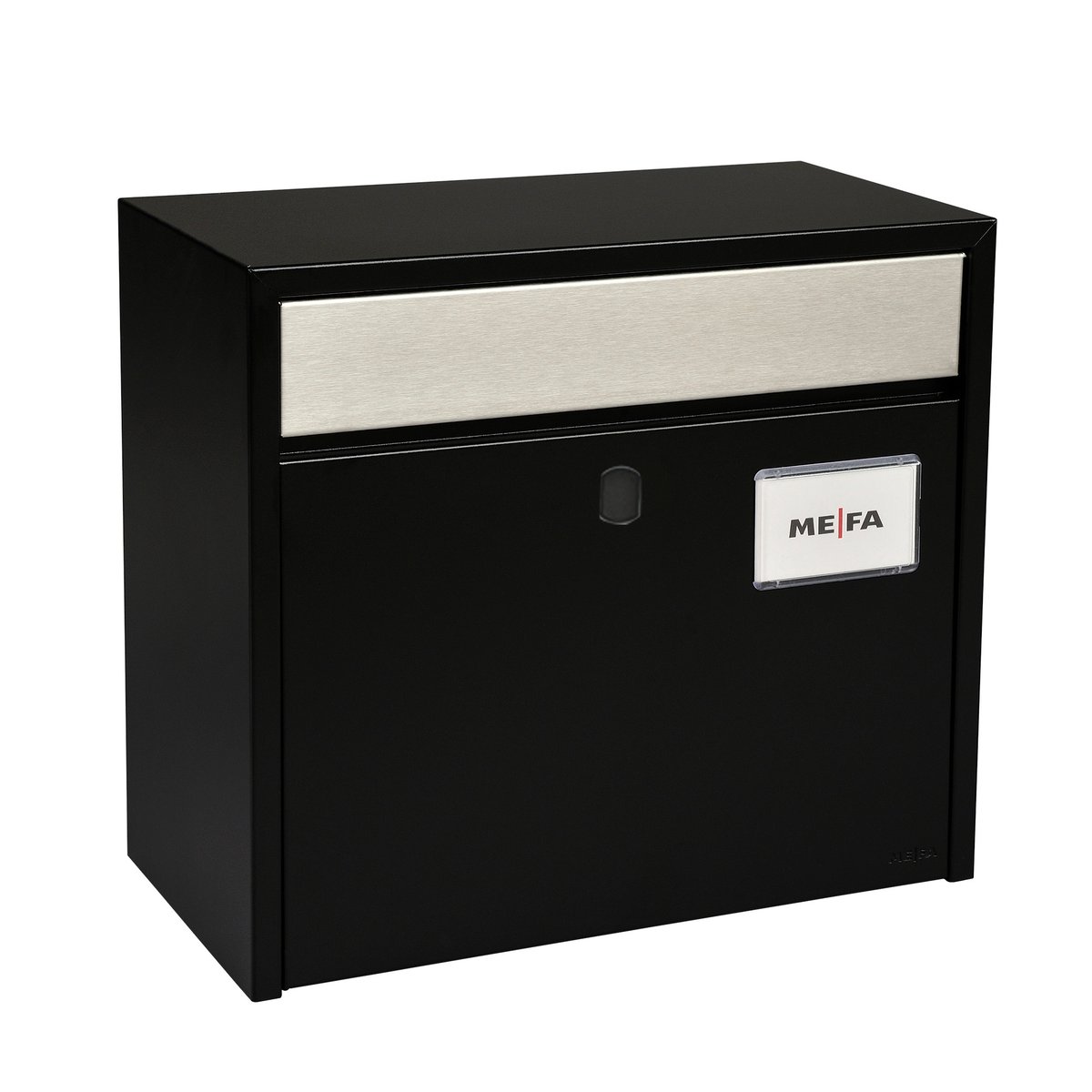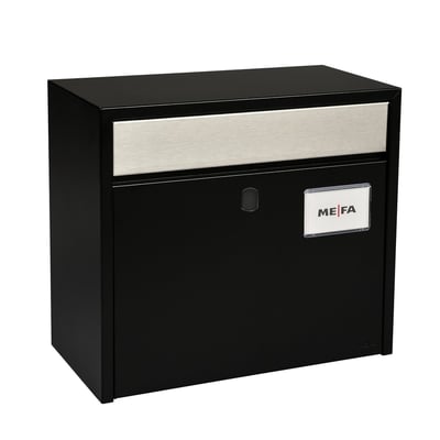 Klassisk firkantet MEFA Etude postkasse med integreret navneskilt og ekstra bredt postindkast. Ideel til større breve.