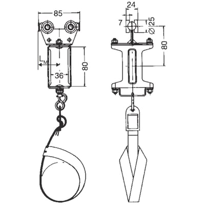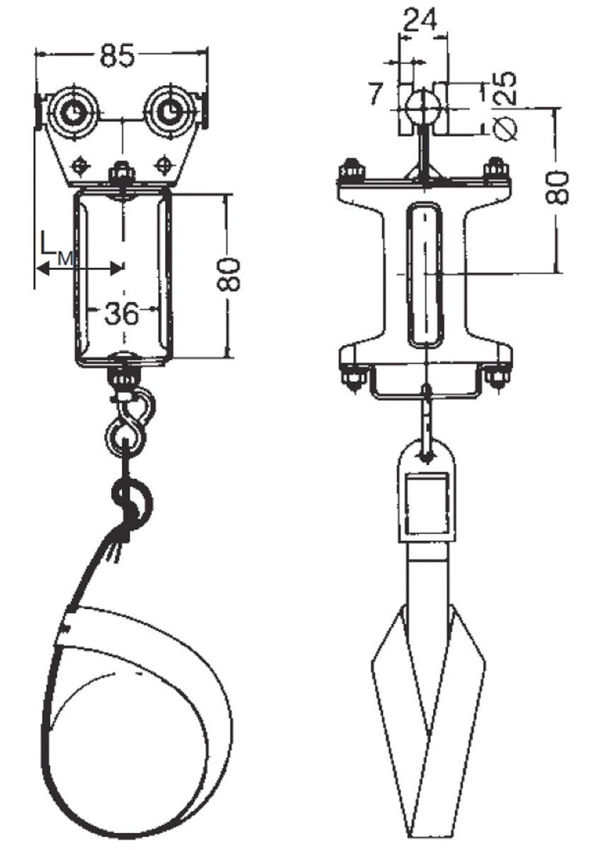 Stål medbringervogn med stålhjul og strop til at føre kabel frem.