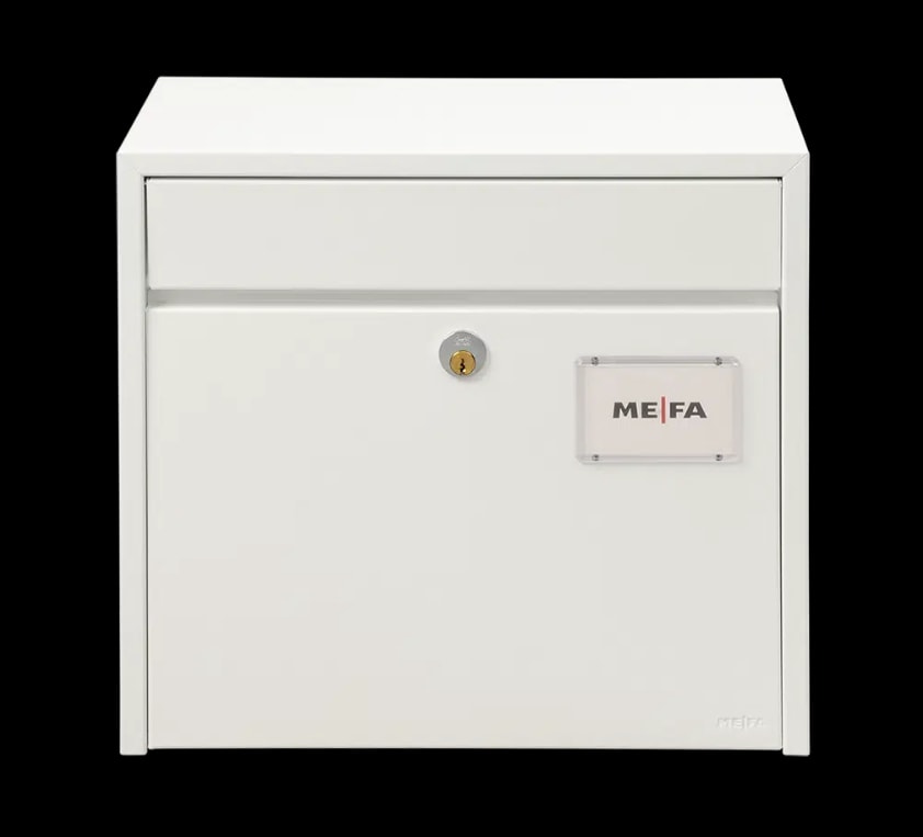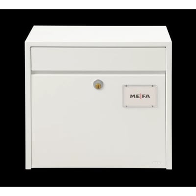 MEFA Etude 900 postkasse i hvid, med en dybde på 200 mm, bredde på 418 mm og højde på 376 mm. Inkluderer lås for sikker posthåndtering.
