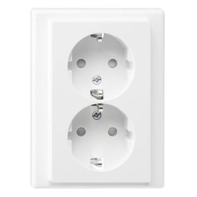 Schneider Electric Merten System M dobbeltstikkontakt i polarhvid. Med sidejord, skodde for øget sikkerhed og en robust konstruktion af polykarbonat.