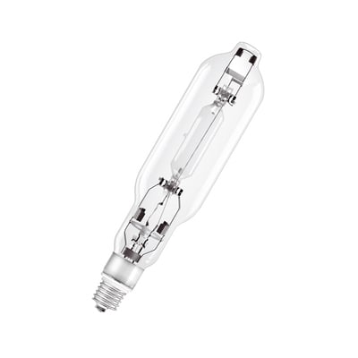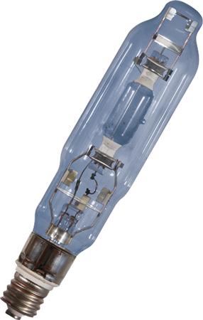 Metalhalogen udladningslampe med en-soklet quartz-brænder. Lampen er rørformet og har en klar farve.