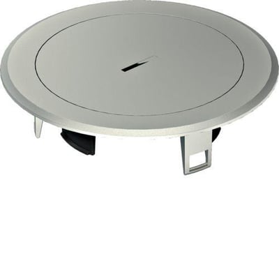 Metallåg med blindlåg i sølv fra Hager. Overflade med struktur og en udvendig diameter på 150 mm. Velegnet til gulvkanaler og montering på hævet gulv.