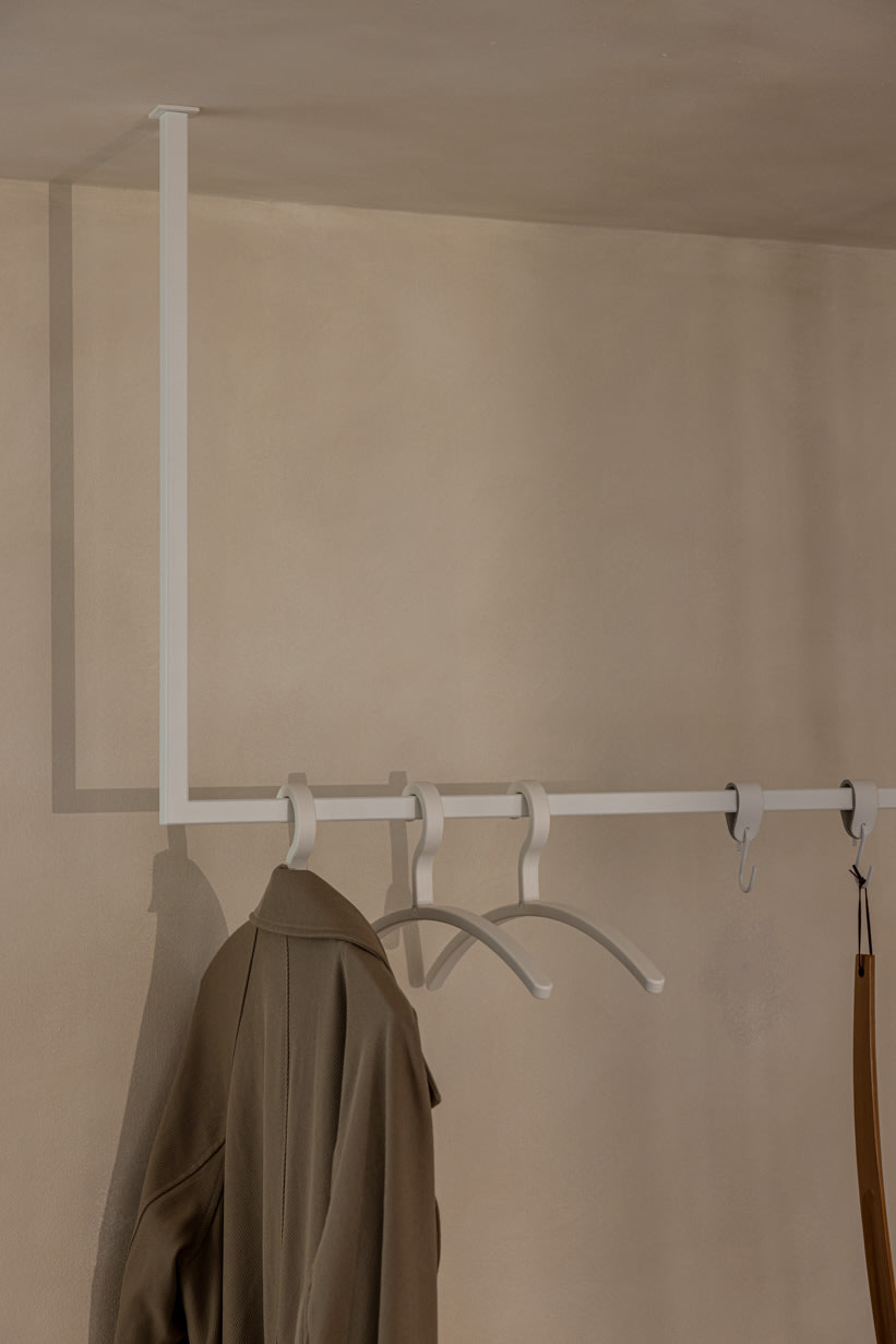 Dette lofthængte tøjstativ fra Metallbude, model Rubi, er en stilfuld og funktionel løsning til opbevaring af tøj. Stativet er fremstillet i robust metal og udført i en elegant mat hvid finish, der passer ind i de fleste indretninger.