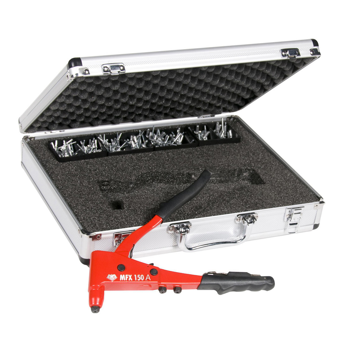 MFX150AS enhåndstang med sortiment af nitter (Ø2,4 - 5,0 mm) og R1001 multigrip nitter i forskellige størrelser. Leveres i praktisk alukuffert.